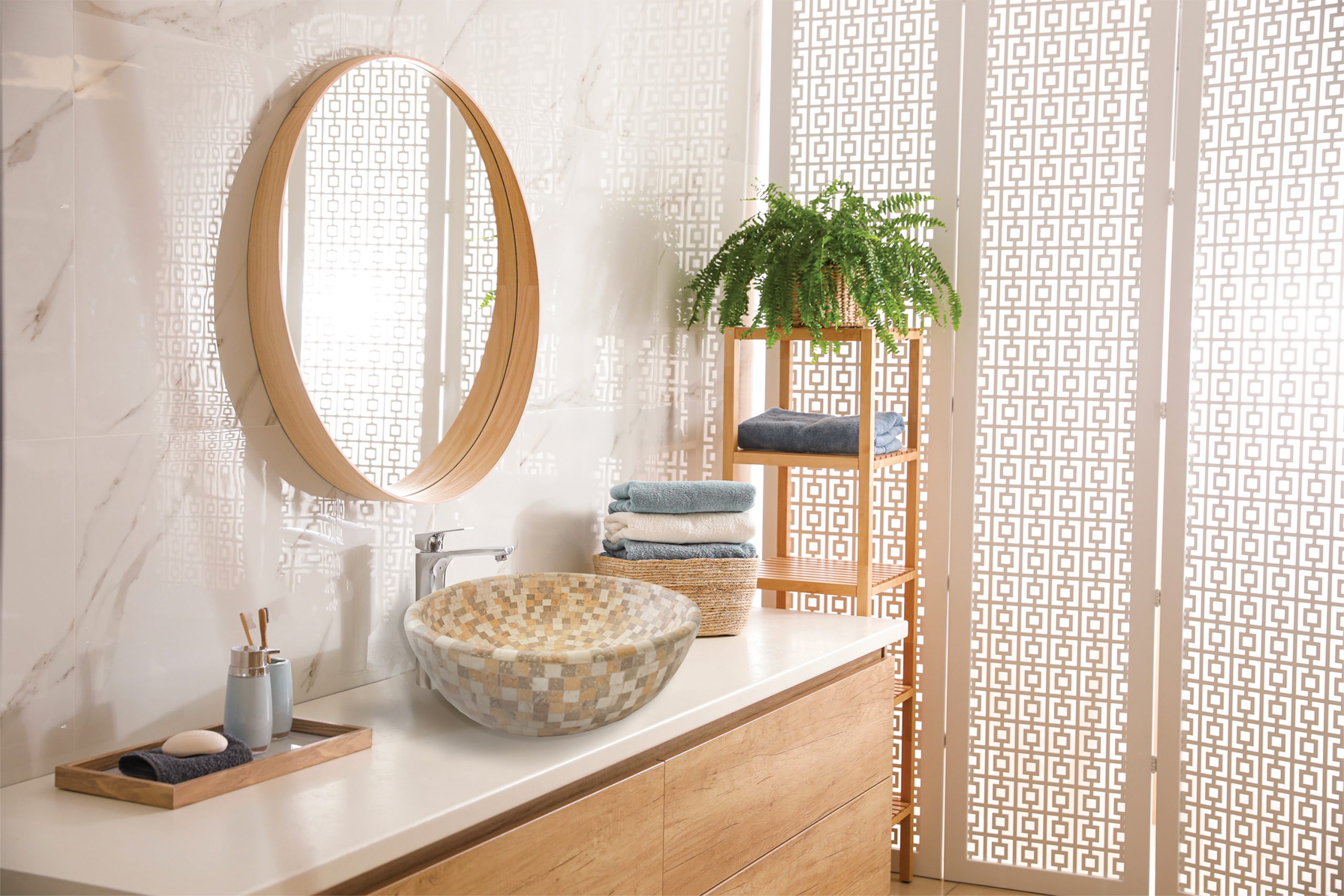 Taillée au cœur du bloc de travertin, la vasque Carmen peut être sujette à de légères variations de coloris, d’aspects et de dimensions.